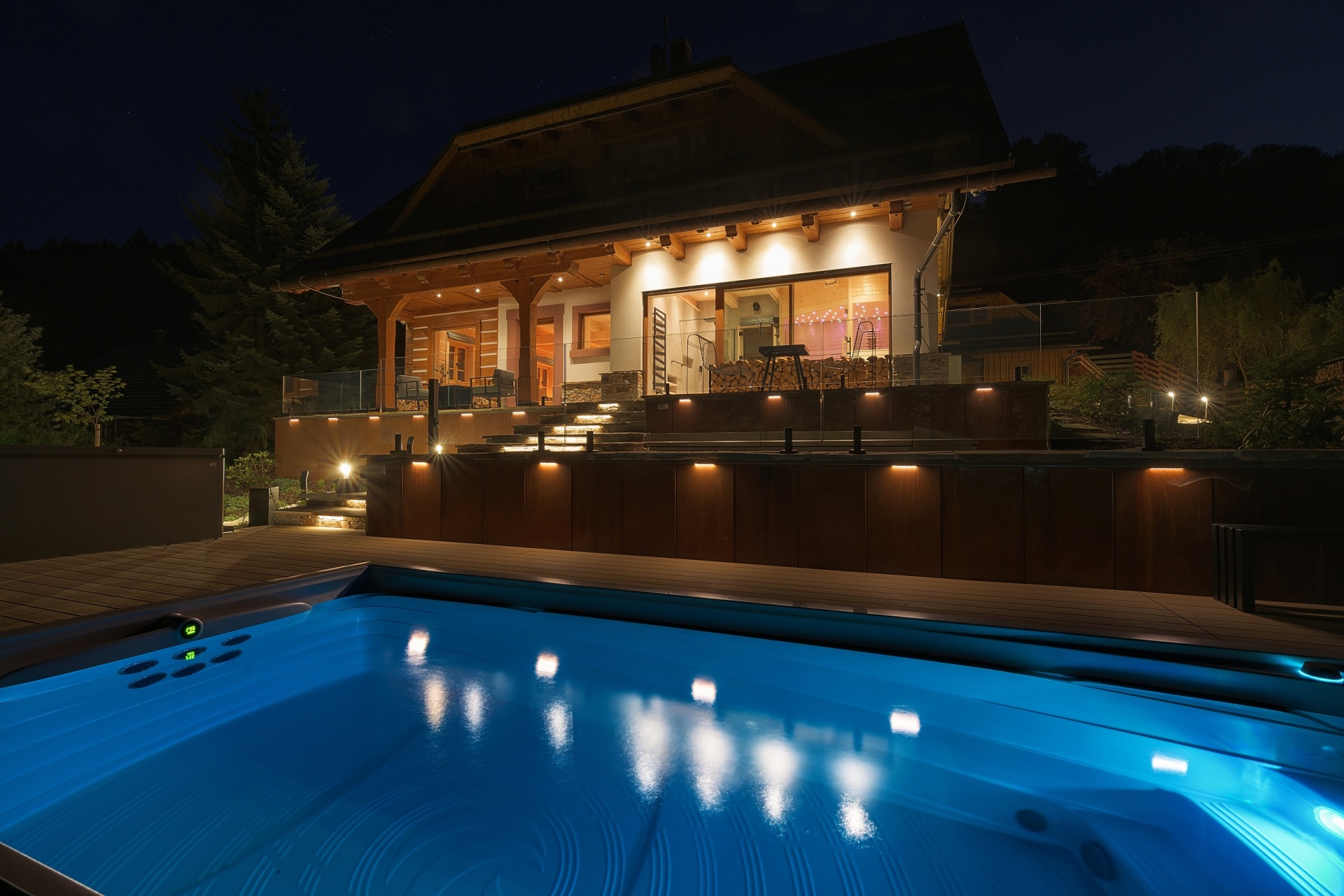 Finnish sauna with infrared heater and direct access to the terrace to the whirlpool for 5 people or the heated pool with counter-current and bubbles
